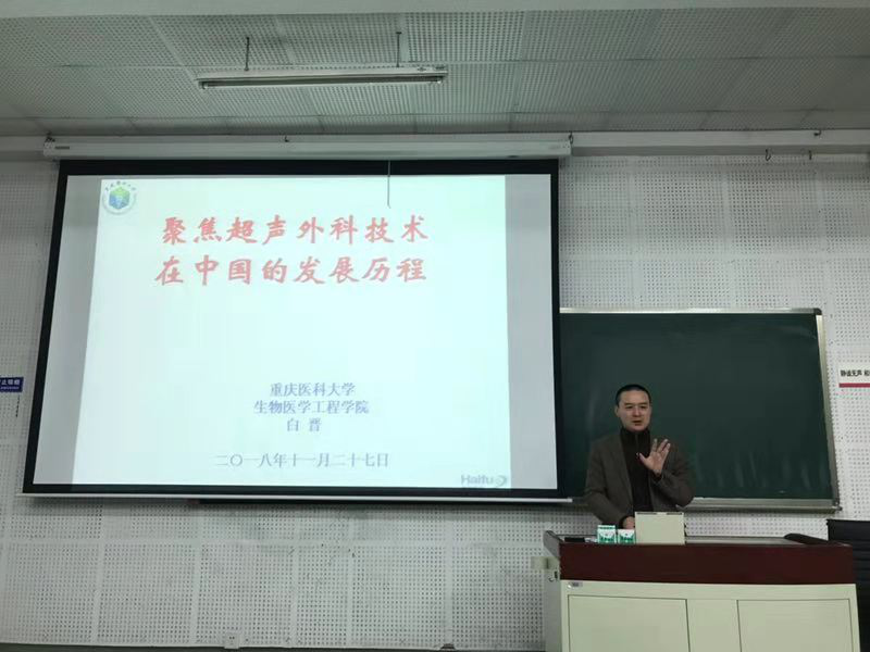 2018年11月27日下午,重慶醫科大學生物醫學工程學院院長,重慶市著名眼科專家白晉教授在四川外國語大學宏文樓1-1教室,舉行了題為“聚焦超聲外科技術在中國的發展歷程”的科普講座。本次講座旨在讓師生更深入的了解海扶醫療科技有限公司以及聚焦超聲技術的發展歷程。