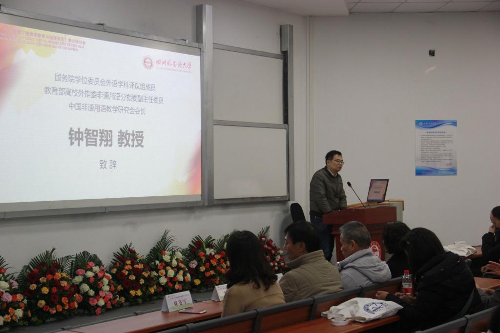 開(kāi)幕式于6日上午在培英樓放映廳舉行,由東方語(yǔ)學(xué)院院長(zhǎng)羅文青教授主持。開(kāi)幕式以四川外國(guó)語(yǔ)大學(xué)越南語(yǔ)專(zhuān)業(yè)十周年紀(jì)念視頻和2018級(jí)越南語(yǔ)專(zhuān)業(yè)學(xué)生的朗誦表演“我的春天”揭開(kāi)序幕。四川外國(guó)語(yǔ)大學(xué)副校長(zhǎng)鄭白玲教授,教育部高校外指委非通用語(yǔ)分指委主任委員、中國(guó)非通用語(yǔ)教學(xué)研究會(huì)副會(huì)長(zhǎng)姜景奎教授分別致辭。四川外國(guó)語(yǔ)大學(xué)教務(wù)處處長(zhǎng)嚴(yán)功軍、重慶非通用語(yǔ)學(xué)院院長(zhǎng)劉忠政也出席了開(kāi)幕式。鄭白玲副校長(zhǎng)代表四川外國(guó)語(yǔ)大學(xué)對(duì)蒞臨本次會(huì)議的各位專(zhuān)家學(xué)者表示熱烈地歡迎,并表達(dá)了學(xué)校的期望和要求,最后預(yù)祝會(huì)議取得圓滿成功。姜景奎教授介紹了非通用語(yǔ)教學(xué)的發(fā)展歷史,分析了非通用語(yǔ)教學(xué)的現(xiàn)狀,并指出目前發(fā)展面臨的幾點(diǎn)問(wèn)題:服務(wù)國(guó)家戰(zhàn)略需要的外語(yǔ)人才培養(yǎng)問(wèn)題;中國(guó)非通用語(yǔ)各語(yǔ)種布點(diǎn)數(shù)量待平衡問(wèn)題及非通用語(yǔ)教師教學(xué)科研水平、師資培養(yǎng)和學(xué)歷職稱(chēng)的提升等問(wèn)題。姜景奎教授還指出非通用語(yǔ)正處在崛起時(shí)期,鼓勵(lì)青年投身參與非通用語(yǔ)的建設(shè)。