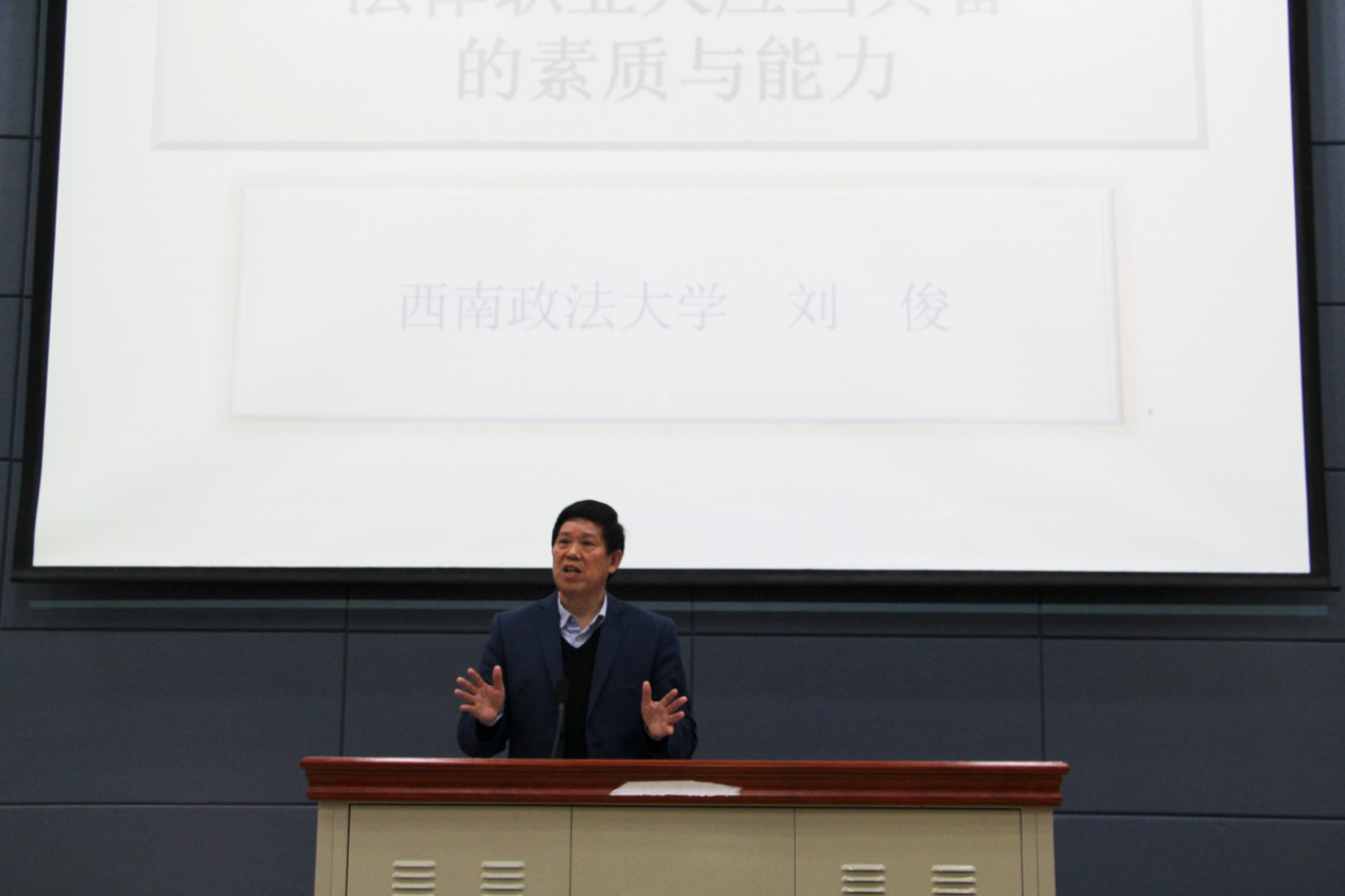 11月8日上午,應(yīng)我校社會(huì)與法學(xué)院邀請(qǐng),西南政法大學(xué)博士生導(dǎo)師、中國(guó)社會(huì)法研究會(huì)副會(huì)長(zhǎng)、中國(guó)農(nóng)村法制研究會(huì)副會(huì)長(zhǎng),原西南政法大學(xué)黨委副書(shū)記、副校長(zhǎng)劉俊教授蒞臨我校,在西區(qū)教學(xué)樓C報(bào)告廳帶來(lái)了以“法律職業(yè)人應(yīng)當(dāng)具備的素質(zhì)與能力”為主題的學(xué)術(shù)講座,講座由社會(huì)與法學(xué)院衡愛(ài)民教授主持。全校200多名師生參加了此次活動(dòng)。