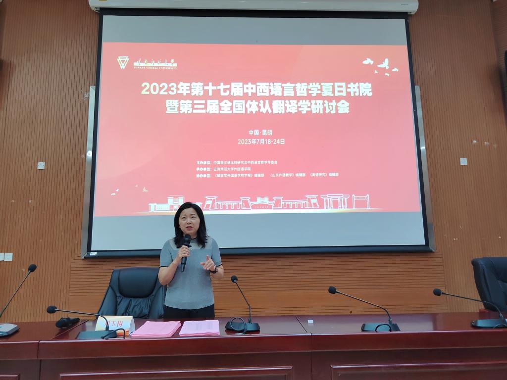 2023年7月19日上午8:30,“第十七屆中西語言哲學夏日書院暨第三屆全國體認翻譯學研討會”順利開幕。開幕式由云南師范大學外國語學院黨委書記王麗峰主持。云南師范大學副校長孟慶紅教授對各位專家學者表示歡迎,指出此次會議是展示高質量研究成果、對哲學、翻譯學等研究領域產(chǎn)生重要而深遠影響的一次盛會。我校副校長祝朝偉教授指出哲學是一門追求智慧的學科,對于講好中國故事、讓外界更好認識中國、建設中國話語體系具有重要的意義。中西語言哲學專委會名譽會長王寅教授感謝了大家長期以來對會議的持續(xù)支持,并回顧了中西語言哲學夏日書院的發(fā)展歷程,展望了未來的發(fā)展。《解放軍外國語學院學報》主編陳勇教授及《山東外語教學》語言學板塊負責人葛云峰教授分別介紹了兩家期刊的辦刊情況,并對大會的召開表示祝賀。