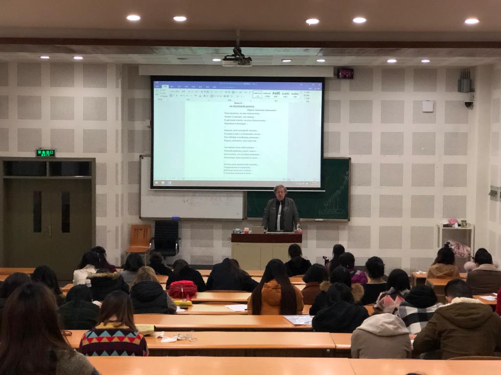 2018年11月18日晚7點,俄羅斯自然科學院院士、俄羅斯國立人文大學教授伊戈爾·瓦基莫維奇·康達科夫為俄語系師生做了系列講座第一場——《作為統一文本的19-20世紀俄羅斯詩歌》,在我校西區教學樓B1-1舉行,講座由俄語系主任徐曼琳教授主持。