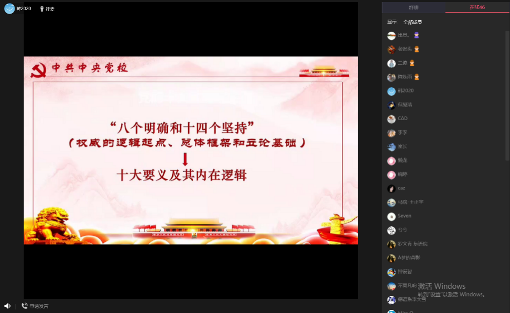 韓慶祥教授以建樓筑房為喻,從歷史方位論、民族復興論、人民中心論比、發展理念論、兩大布局論、戰略安排論、強軍戰略論、命運共同體論、深化改革論、強大政黨論十大要義出發把握“習近平新時代中國特色社會主義思想”的內在邏輯,令老師們印象深刻。首先,韓慶祥分享講解了第一個要義的內涵:歷史方位論,即是地基。中國特色社會主義進入新時代這一歷史方位論是理解整個十九大報告的一個出發點、邏輯起點。韓慶祥深入分析中國特色社會主義進入新時代的三大根據——歷史性成就、歷史性變革、歷史性的影響,并逐步講解新時代的主題和標志,深刻理解習近平新時代中國特色社會主義思想關于我國發展起來以后的“強國理論”。民族復興論和人民中心論是兩大重要基石,民族復興論作為歷史維度,它是實現強起來的歷史使命,人民中心論側重于價值維度,它是價值取向,韓慶祥將人民中心論的本質凝練為:把人民當做主體,一切依靠人民;人民當作目的,一切為了人民;把人民當作尺度,人民至上。發展理念論作為第一根柱子,它是實現強起來的根本之道。韓慶祥從時代背景、本質內涵、貫徹落實三個方面來解析新發展理念。新發展理論即創新、協調、綠色、開放、共享是實施高質量發展的一個根本路徑,滿足人民對高質量產品的日益增長的需求,同時新發展理念是我國發展起來以后從大國成為強國的根本之道。新發展理念關乎我國發展的根本和命運,是衡量現實發展的標尺。而兩大布局論是實現強起來的總體方略,是第二根柱子,韓慶祥著重講解其中兩個難點——兩大布局之間的關系和理解協調推進四個全面戰略。五位一體總體布局與四個全面戰略布局之間是全面和重點的關系,是全方位和核心的關系,是總框架和牛鼻子之間的關系。借助哲學思維來理解協調推進四個全面戰略,辯證思維抓根本,系統思維構整體,戰略思維謀長遠。第三根柱子則是戰略安排論:實現強起來的“兩步走”戰略,既然是戰略安排,又是行動的范疇,它是我黨治國理政的基本經驗。韓慶祥講解了實現強起來的軍事保障——強軍戰略論,形象地將其比作銅墻鐵壁。強軍是為了保護我國在世界中的核心利益,是為了保家衛國,而不是為了稱霸。進而他分析了命運共同體論,將其比作周邊的環境,從世界觀、國家觀、文明觀、義利觀等理解命運共同體的核心,世界多樣,國家平等,文明互鑒,包容發展,互利普惠。最后,韓慶祥分別將深化改革論與強大政黨論擬人化為建筑工和頂層設計師。他從改革的根據、作用、方向、目標和主體等五個方面把握總書記的深化改革論,從強黨建設的總思路、強黨建設的總框架、領導主體、治理客體、強黨建設的落腳點等層面深入分析了強大政黨論,強大的政黨是實現強起來的領導力量。