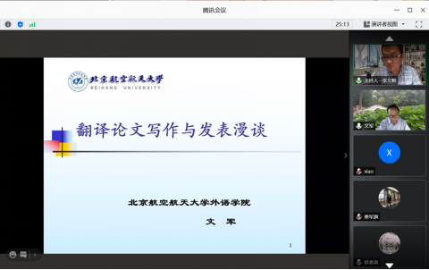 9月8日上午,北京航空航天大學文軍教授應邀為我校師生進行了一場題為“翻譯論文寫作與發表漫談”的線上學術講座。此次講座是川外70周年校慶學術系列講座之一,由翻譯學院張文鶴博士主持。講座采用騰訊會議直播的形式,現場反響熱烈。