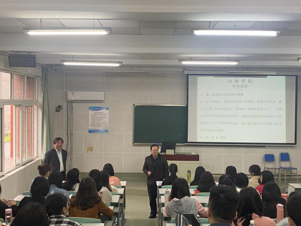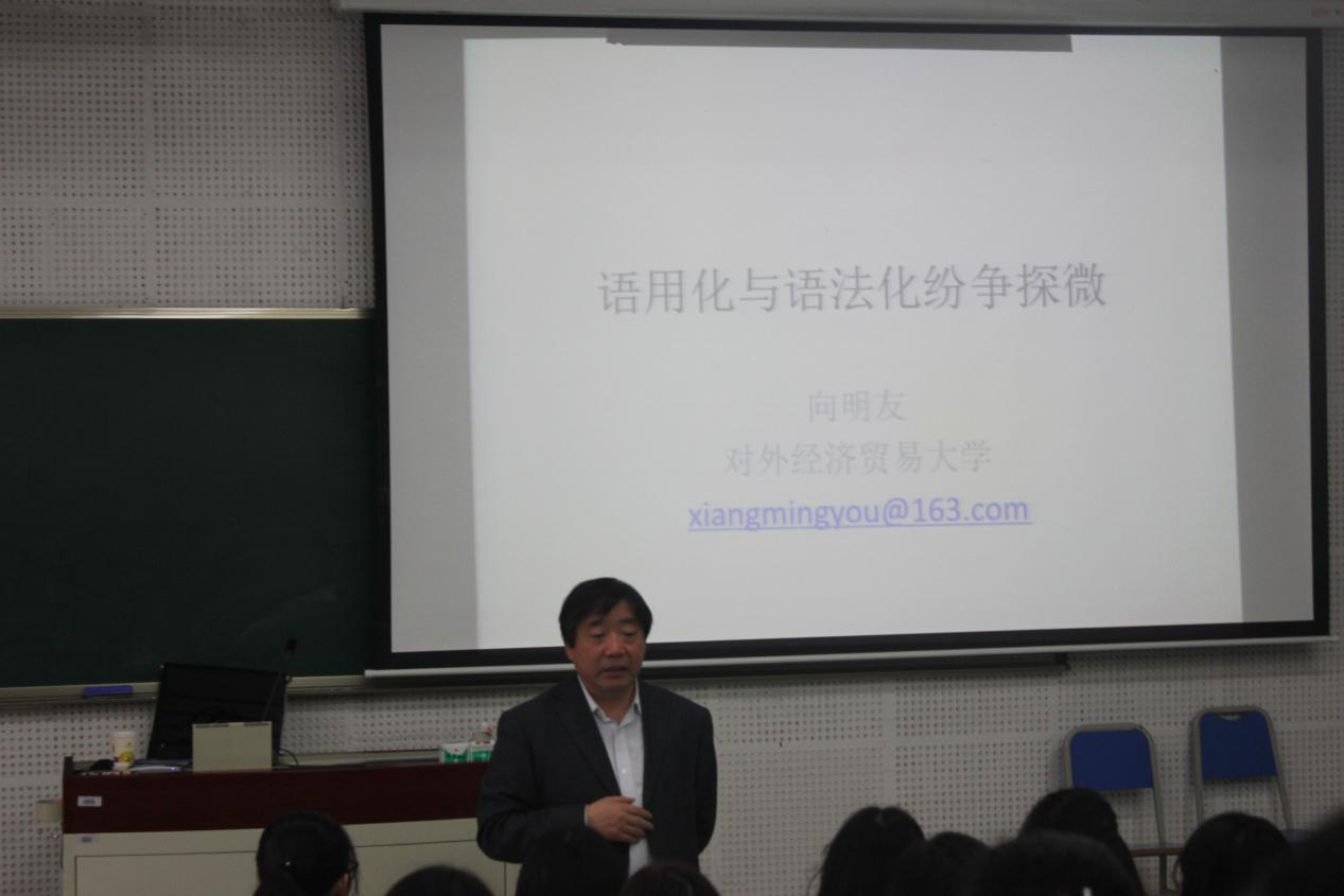 11月8日上午10:00,應語言智能學院、語言腦科學研究中心及川外學壇的邀請,國務院學科評議組成員、中國語言教育研究會副會長、對外經濟貿易大學博士生導師向明友教授在宏文樓舉行了題為“語用化與語法化紛爭探微”的學術講座。本次活動由語言智能學院執行院長、語言腦科學研究中心主任、博士生導師姜孟教授主持,我校眾多教師以及碩博士研究生參加了此次講座。