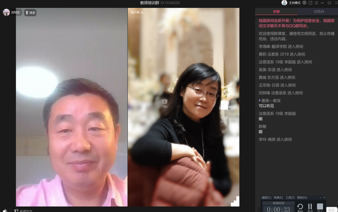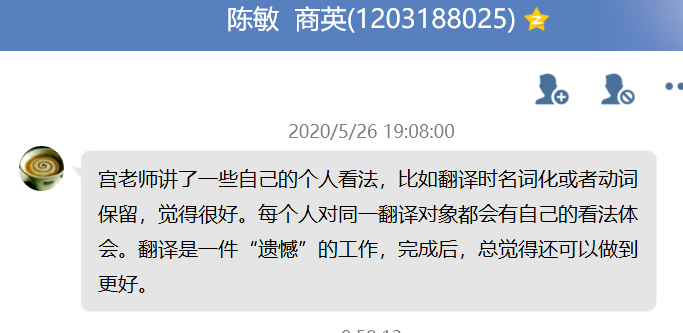 宮教授的講座也讓學生們受益匪淺,2018級法意語系的學生葉月梅說,“首先很榮幸能聽到宮老師的線上講座,以往很少能聽到真正的幕后政治翻譯專家的分享。最大的感受就是譯者在面對政治文本翻譯時所付出的巨大努力。在翻譯具有中國特色的政治詞時,譯者更加謹慎,反復推敲,在體現中國特色和被目的語讀者所理解中做一個權衡和平衡。再者,這本書的多種譯本的出版,也讓我更加體會到話語權的重要性,以及國家層面所作出的努力。”