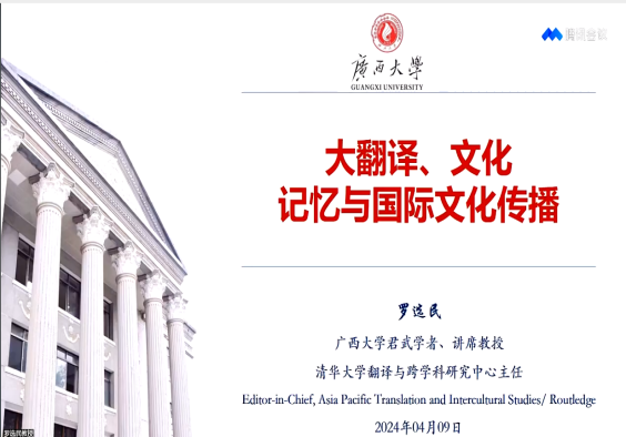 羅教授的講座圍繞發表于《外國語文》2024年第1期特稿專欄的“大翻譯與文化記憶:融合與啟示”一文展開,并廣泛擴展了論文的內涵和外延,用大量實例解釋了文中的理論概念,將平面的文字轉換為立體、生動、趣味性強的試聽盛宴,將理論的思辨融入個案的闡釋中。具體而言,羅教授首先對“大翻譯”的內涵與外延進行了詳細闡發,繼而從“莎士比亞”“塞萬提斯”以及“湯顯祖”三大家文本的傳播與經典化為切入點,并結合本人在海內外的實際體悟,為聽眾提供了對“個體記憶/集體記憶”“集體記憶/文學經典”“交往記憶/文化記憶”等概念的具體所指,還生動地介紹了他本人與莎翁戲劇演繹、塞萬提斯經典化、西南聯大記憶、《魯拜集》的文學與翻譯之緣。羅教授以嚴謹的理論素養梳理了大翻譯思想的流變性、交往性以及媒介性,同時以風趣的案例與豐厚的學識闡明了“文化記憶生成”與“文學翻譯經典”的邏輯關聯,為聽眾帶來了一場既有理論思辨又有實踐關照、既有人文情懷又有學術見解的文學翻譯思想盛宴。
