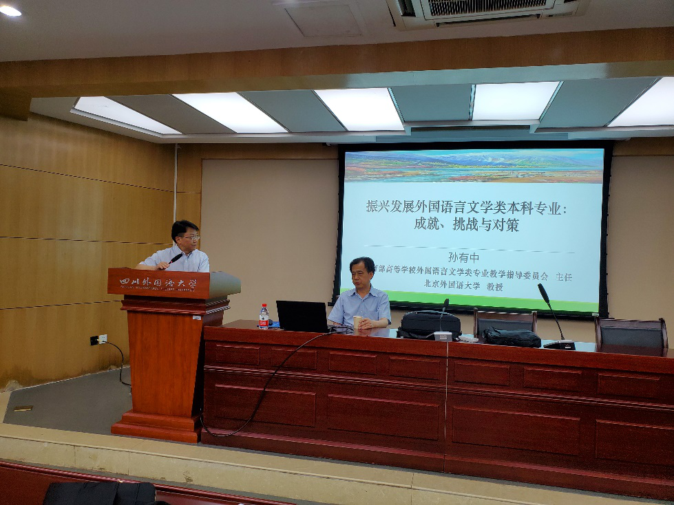 2019年6月14日,教育部高等學(xué)校外國語言文學(xué)類專業(yè)教學(xué)指導(dǎo)委員會主任委員、北京外國語大學(xué)副校長孫有中教授在四川外國語大學(xué)西區(qū)辦公樓A609會議室為英語學(xué)院全體教職員工舉行了題為“振興發(fā)展外國語言文學(xué)類本科專業(yè):成就、挑戰(zhàn)與對策”的講座。四川外國語大學(xué)英語學(xué)院院長張旭春教授主持了講座。
